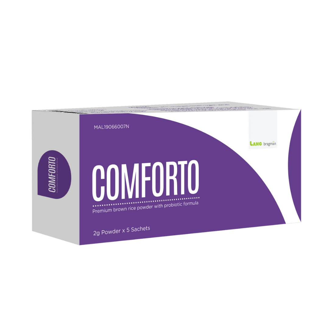 COMFORTO contains a blend of 3 special probiotics ie Bifidobacterium animalis subsp. lactis LAFTI B94, Lactobacillus rhamnosus R0011, Lactobacillus acidophilus R0052 and FOS (Fructooligosaccharides) as a prebiotic source. It also contains Brown Rice powder.